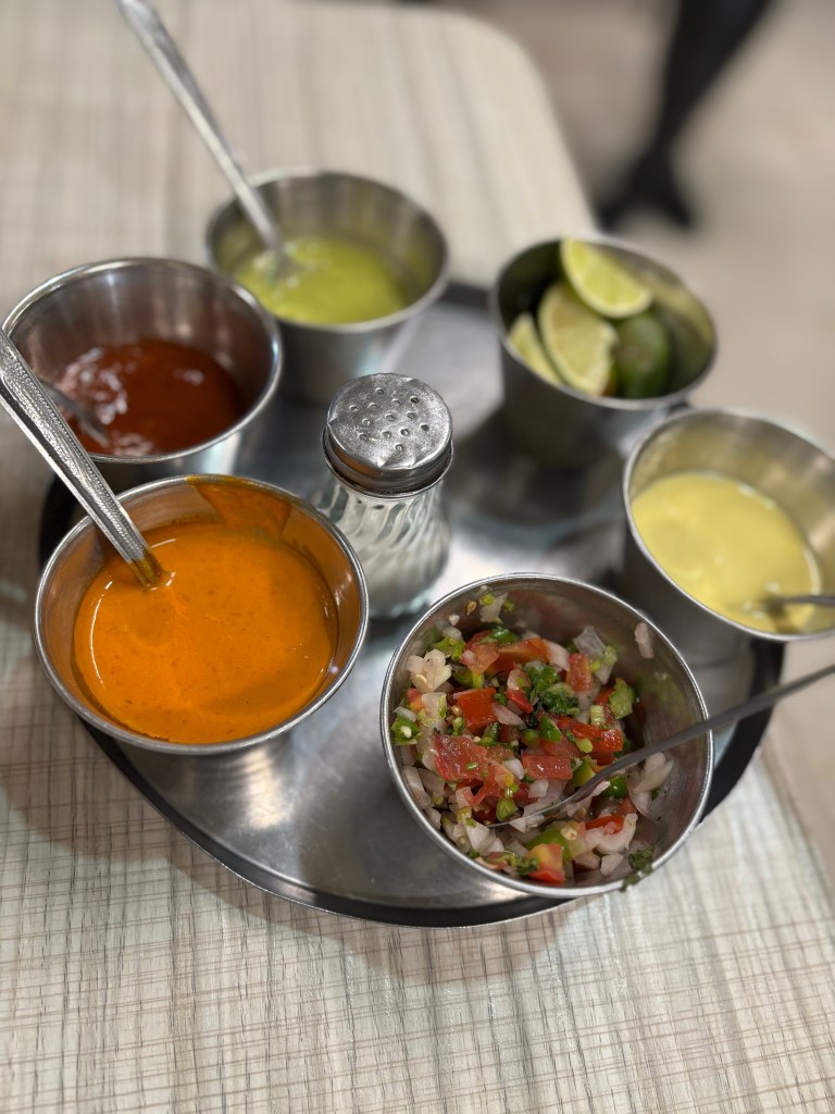 El punto fuerte, sin duda, es la variedad de salsas: cinco opciones bien pensadas, todas de excelente sabor, con mención especial para la salsa roja taquera, picosita, intensa y con gran personalidad. Los tacos están servidos con porciones suficientes, aunque el precio es algo elevado para lo que ofrecen.