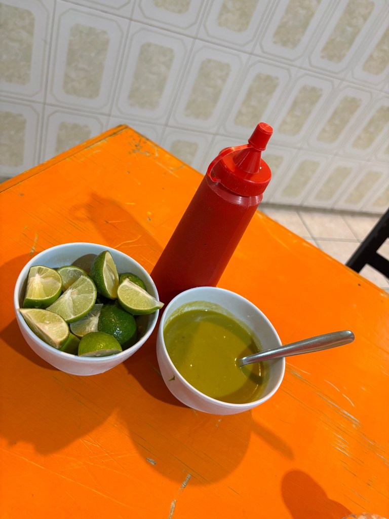 Las tortillas medianas, servidas de a dos por taco, vienen bañadas en aceite y ligeramente tostadas, aportando una textura firme sin ser crujientes. Aunque la variedad de salsas es limitada —solo verde y roja taquera— ambas están muy bien logradas y cumplen con creces.