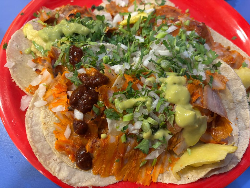 La carne al pastor es buena, aunque no memorable. Cumple con lo esperado para un establecimiento de este tipo: un sabor estándar que satisface el antojo, pero que no deja una impresión duradera. Las tortillas son medianas y se sirven de dos por taco, aunque a diferencia de las taquerías tradicionales, no están bañadas en aceite, lo que les resta ese toque callejero tan característico.