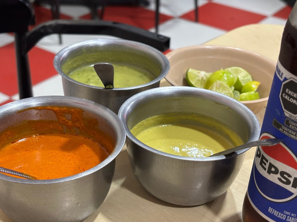 Las tortillas son pequeñas pero excelentes, servidas de a dos y bien bañadas en la grasa que se desprende del trompo. En cuanto a las salsas, hay tres opciones: verde taquera, roja y otra verde más picante, suficientes para darle variedad al sabor.